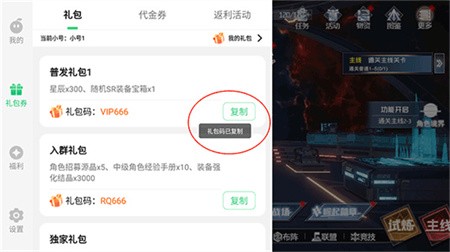 1、进入游戏后,点击礼包券,这里提供了很多福利礼包,点击复制礼包码;