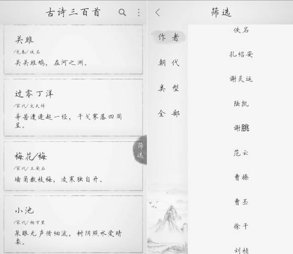 古诗三百首收录了近300首经典的古诗词,不同的韵律和格律,朗朗上口,配以详尽的注释,翻译和赏析,加上独特的水墨风格设计,很好的诠释了中国文化精髓,为读者提供了丰富的想象空间和审美。古诗三百首既可以帮助读者更好地理解和背诵宋词,也可作为精美的收藏、分享。