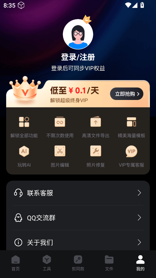 2、打开便是首页、工具、剪同款、文件、我的这五大板块!件支持 AI文生图、AI图生图、AI写真,不管您以何种方式出图,几乎都能够满足您的需求,并且还提供了海量的模板供您使用!
