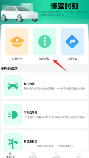 1、进入懂驾速查APP后,在首页导航栏选择"懂驾时刻"板块,点击"交通信号灯"专题。
