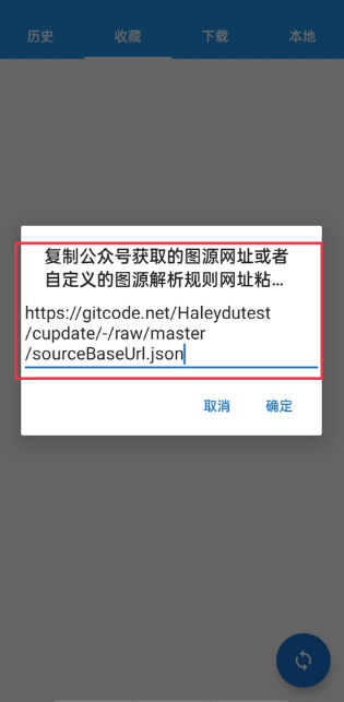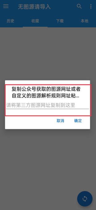 打开 APP 后,会弹出提示窗口(含复制公众号相关提示),将第三方图源网址复制粘贴至对应输入框;