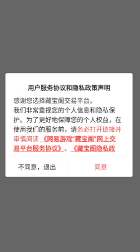 1、打开藏宝阁手游交易平台,仔细阅读用户隐私协议后点击 “同意”,即可进入平台主界面。